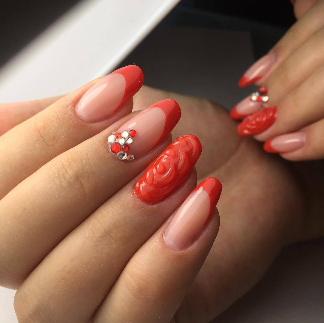 Также не стесняйтесь выбирать яркие цвета лака или геля. Ваша лепнина на таком покрытии может иметь красочный дизайн. Часто в таком варианте безымянный палец выделяется стразами или камнями.