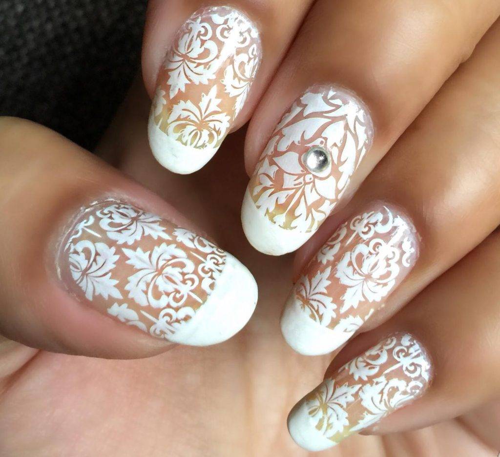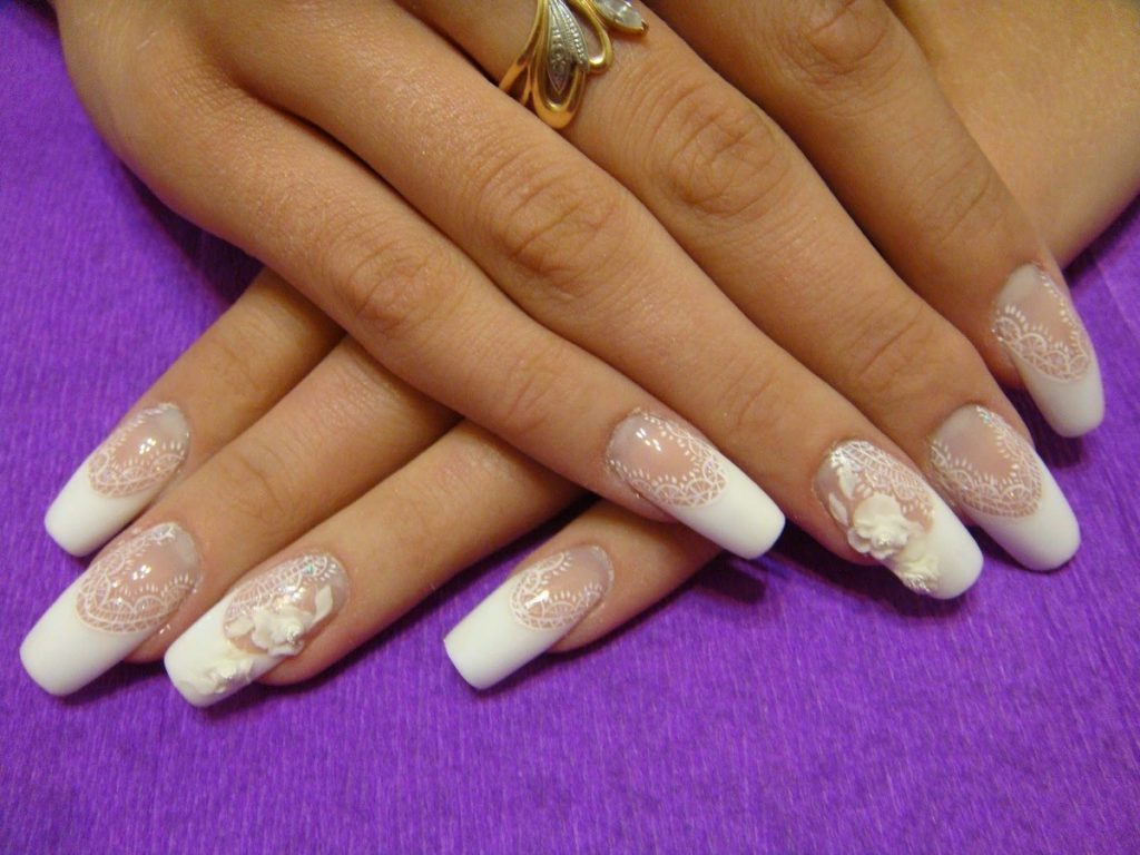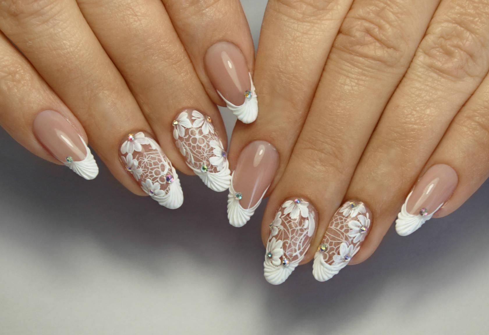 Однако не стоит их употреблять в слишком большом количестве, чтобы не отвлечь внимание от главного рисунка. Чтобы создать свадебный маникюр, необходимо рисовать белое кружево, а затем украшать его белыми элементами