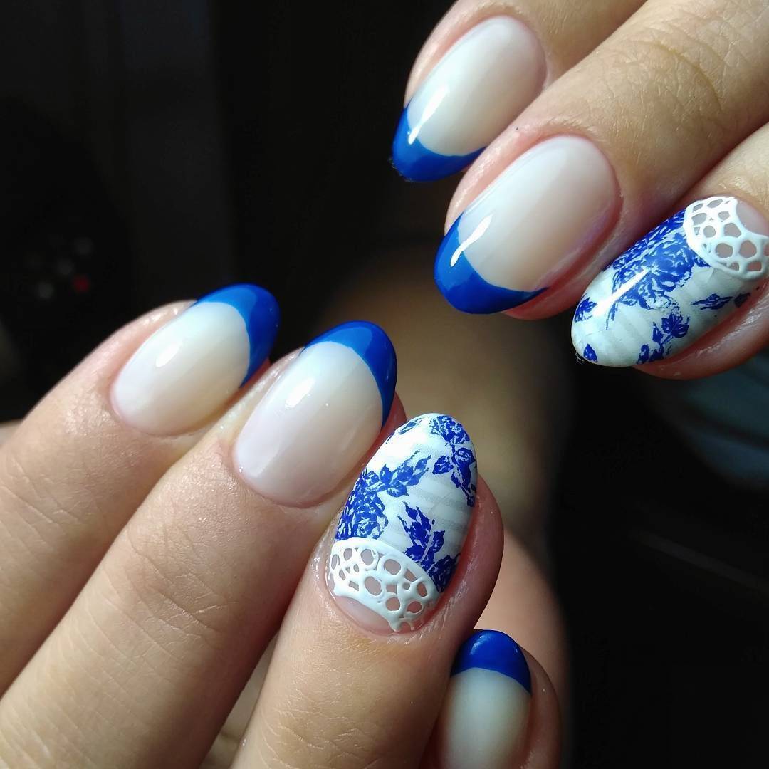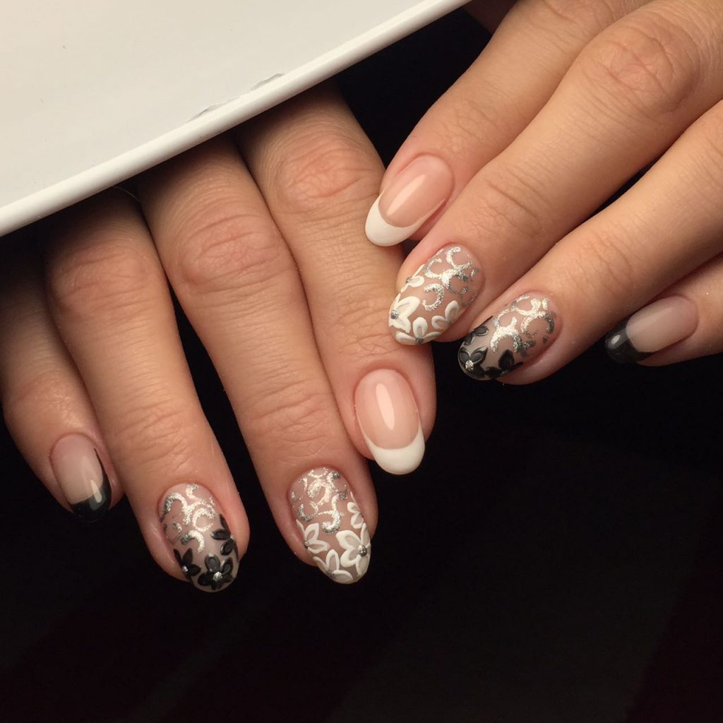 Можно смело обращать внимание на косой френч, лунный маникюр и даже перевернутый. В некоторых вариантах вместо стандартного выделения зоны улыбки белой полосой используйте сам ажурный узор