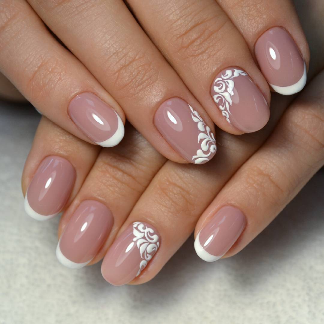 Кружевной маникюр отлично сочетается с классическим френчем. Он смотрится нежно и торжественно, поэтому такой дизайн часто выбирают невесты, хотя в повседневных условиях он будет уместен. Вы можете украсить кружевом все ноготки или выделить им акцентированные.