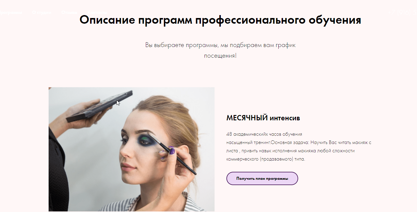 48 академическийх часов обучениянасыщенный тренинг.Основная задача: Научить Вас читать макияж с листа , привить навык исполнения макияжа любой сложности коммерческого (продаваемого) типа.