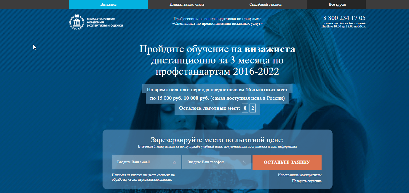 Название программы: Специалист по предоставлению визажных услуг.Вид образовательной программы: профессиональная переподготовка.Формат обучения: дистанционный (без отрыва от работы, в любом городе РФ).Продолжительность курса: 3 месяца.Объем программы: 520 часов.Требования: наличие высшего или среднего профессионального образования.