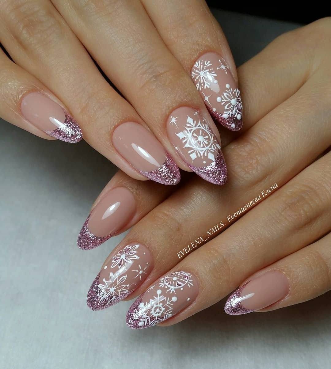 На ногтевой пластине рисуются одна или две снежинки и украшаются блестками или красивыми переливающимися стразами для придания ногтям дополнительного шика в новогоднюю ночь.