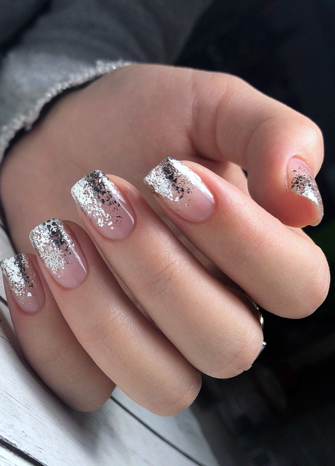 эффектный маникюр с белым лаком и темно-серыми блестками в стиле «скорлупа»