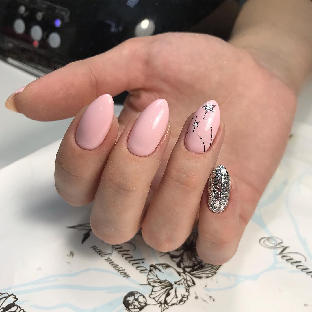 Что касается блестящего декора, то со светлыми тонами “дружат” практически весь представленный в нейл-индустрии материал. Одно из самых удачных сочетаний – это светлые тона и серебряный глиттер. Такой тандем не претендует на эффектный и вызывающий вид, при этом выглядит невероятно нежно и женственно.
