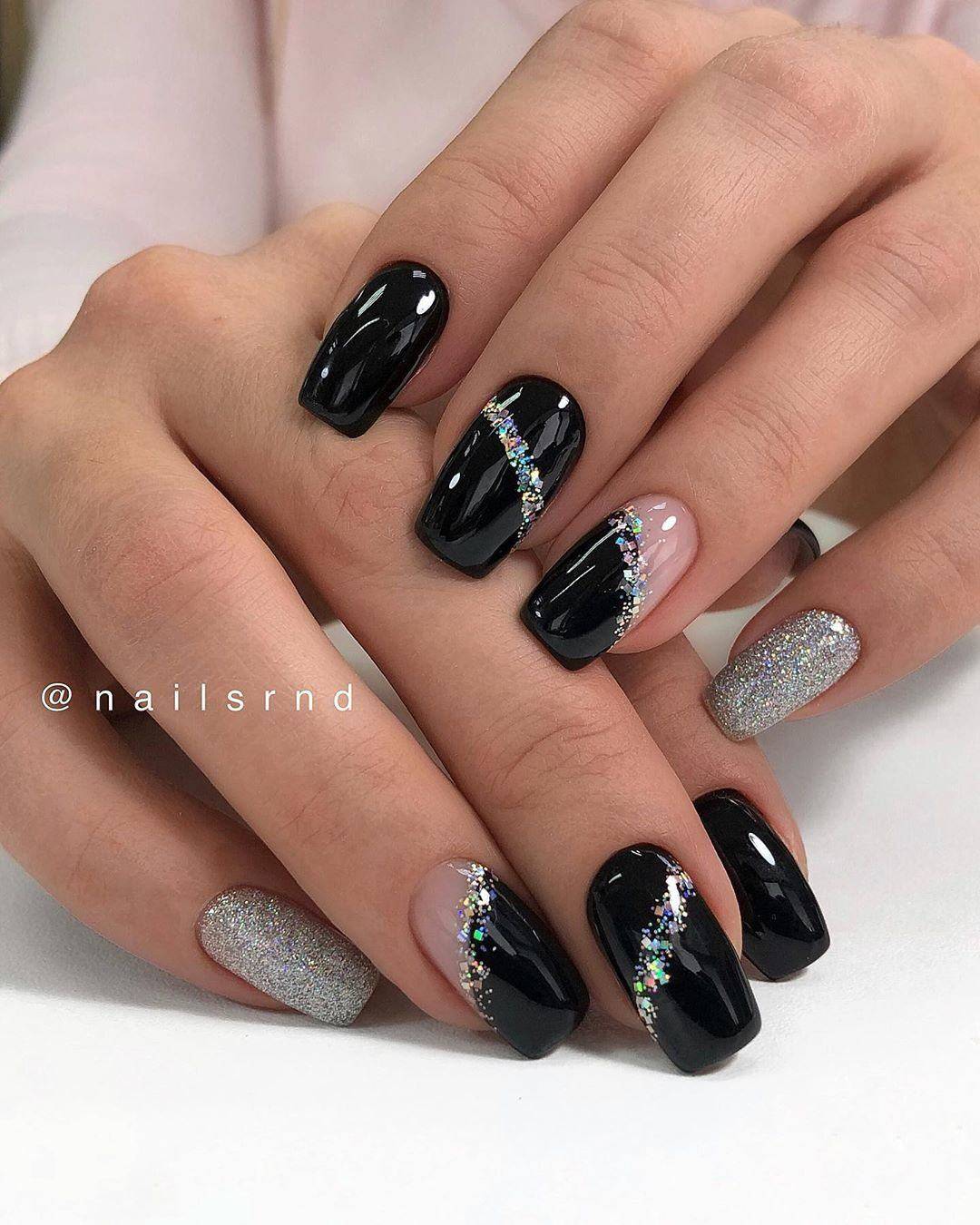 Однотонный черный маникюр без какого-либо декора, несомненно, будет выглядеть банально и пусто. Добавьте к черному цвету серебряные или золотые блестки и дизайн будет выглядеть гораздо эффектнее. Выбирайте для декора мелкий глиттер, втирку, меланж в черном цвете, “сахарок” и другие разновидности блестящего декора. Под дизайн отведите безымянный палец или мизинец. Так маникюр будет выглядеть сбалансировано и сдержанно.