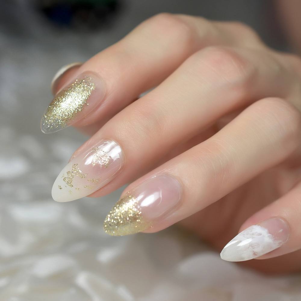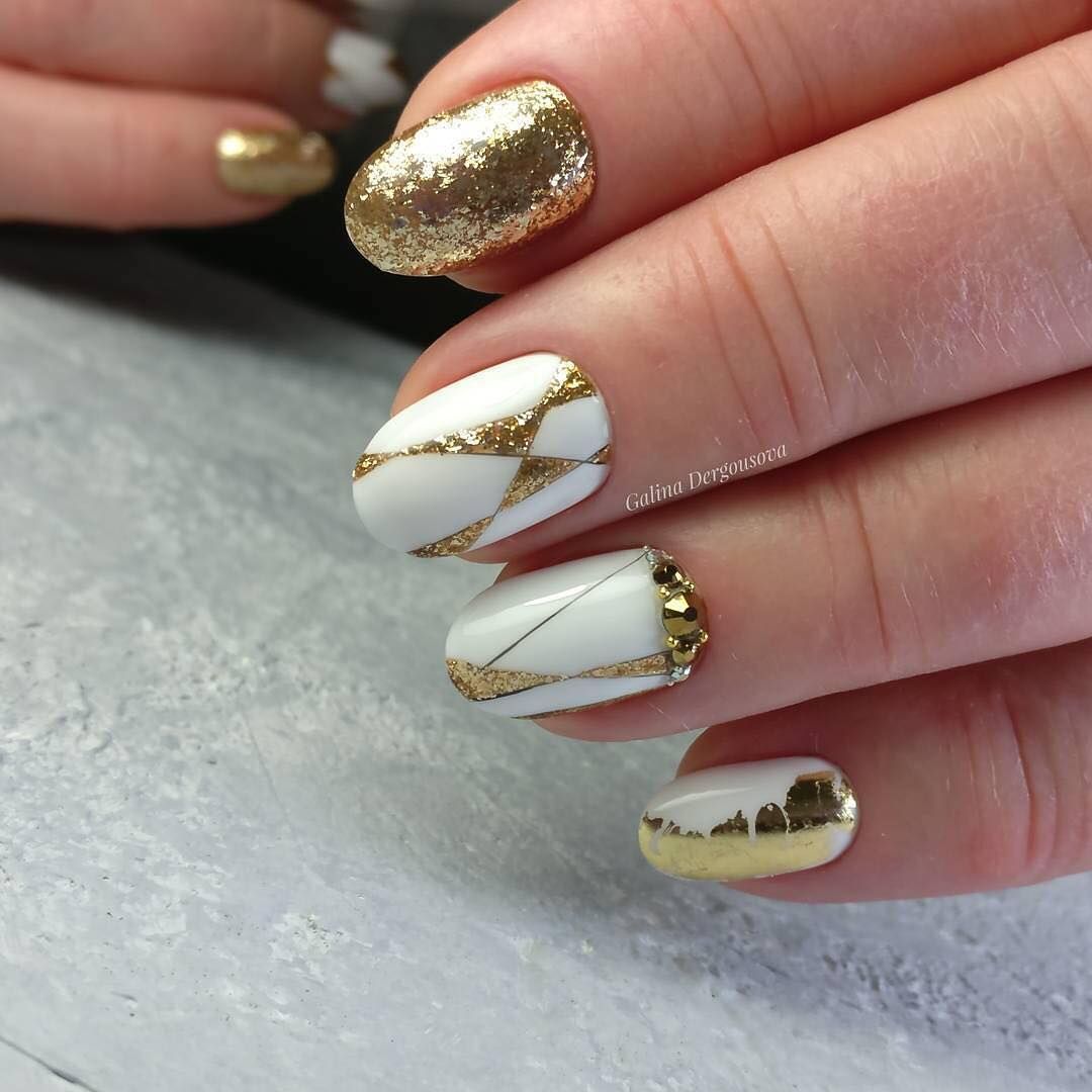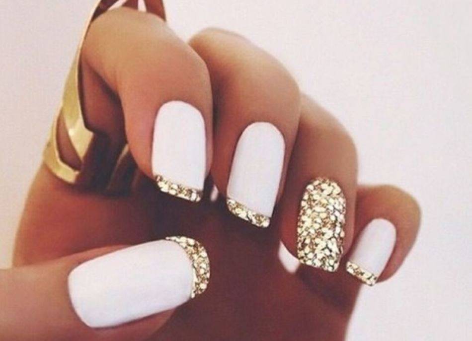 красивый маникюр с белым лаком, декорированный золотыми блестками