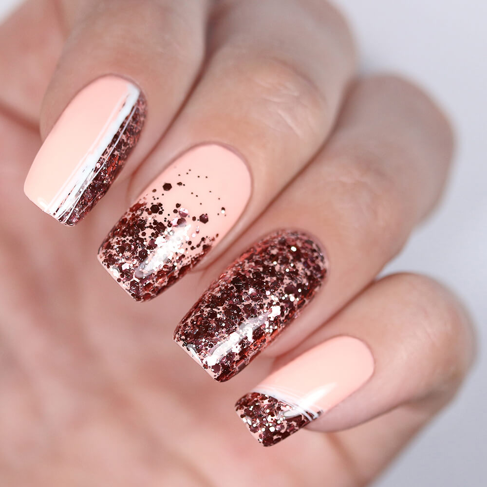 Для нейл-дизайна на короткие ногти следует выбирать мелкий глиттер, он позволит визуально удлинить ногтевую пластину.