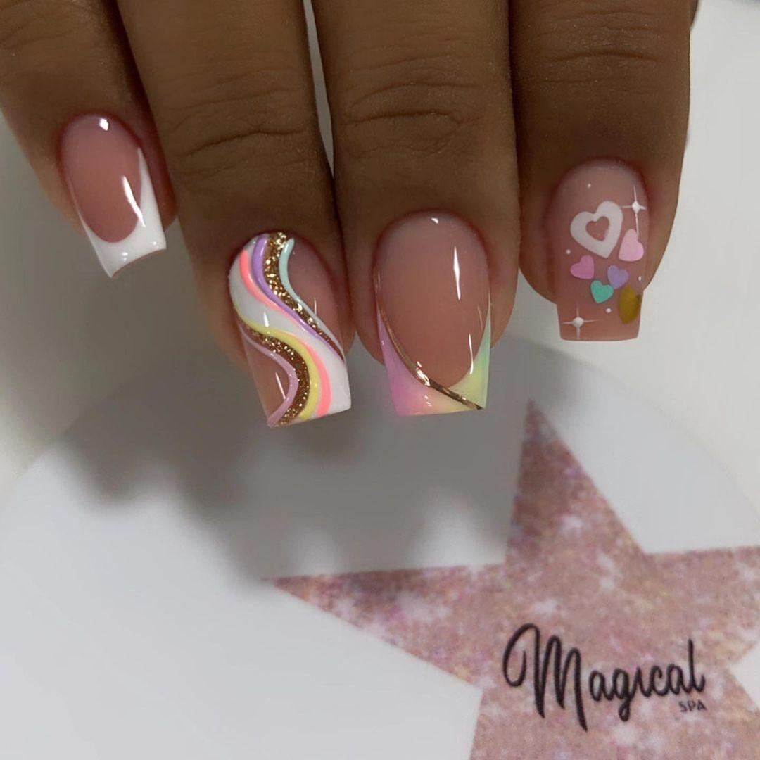 В тренде разноцветный маникюр, когда отдельные пальцы окрашивают белым лаком, а остальные — другими цветами. Дополняют композицию декором, росписью. Вариантов подобного маникюра множество, все зависит от концепции дизайна.