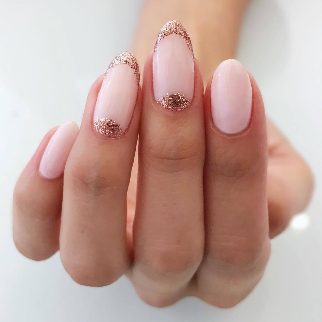Идею сочетания розового лака с блестящими частицами можно уверенно отнести к одним из самых стильных и женственных примеров, которые будут актуально смотреться в любой ситуации и в любое время года. Подобный вид оформления особенно интересно проявляет себя в компании с овальной формой ногтевых пластин, являющейся беспроигрышным решением для большинства дам