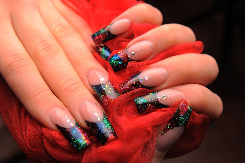 эффектный маникюр на нарощенных ногтях с разноцветными блестками