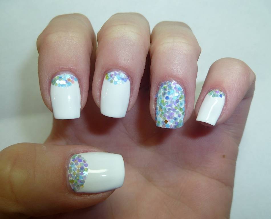 простой вариант маникюра с белым лаком и крупными круглыми блестками