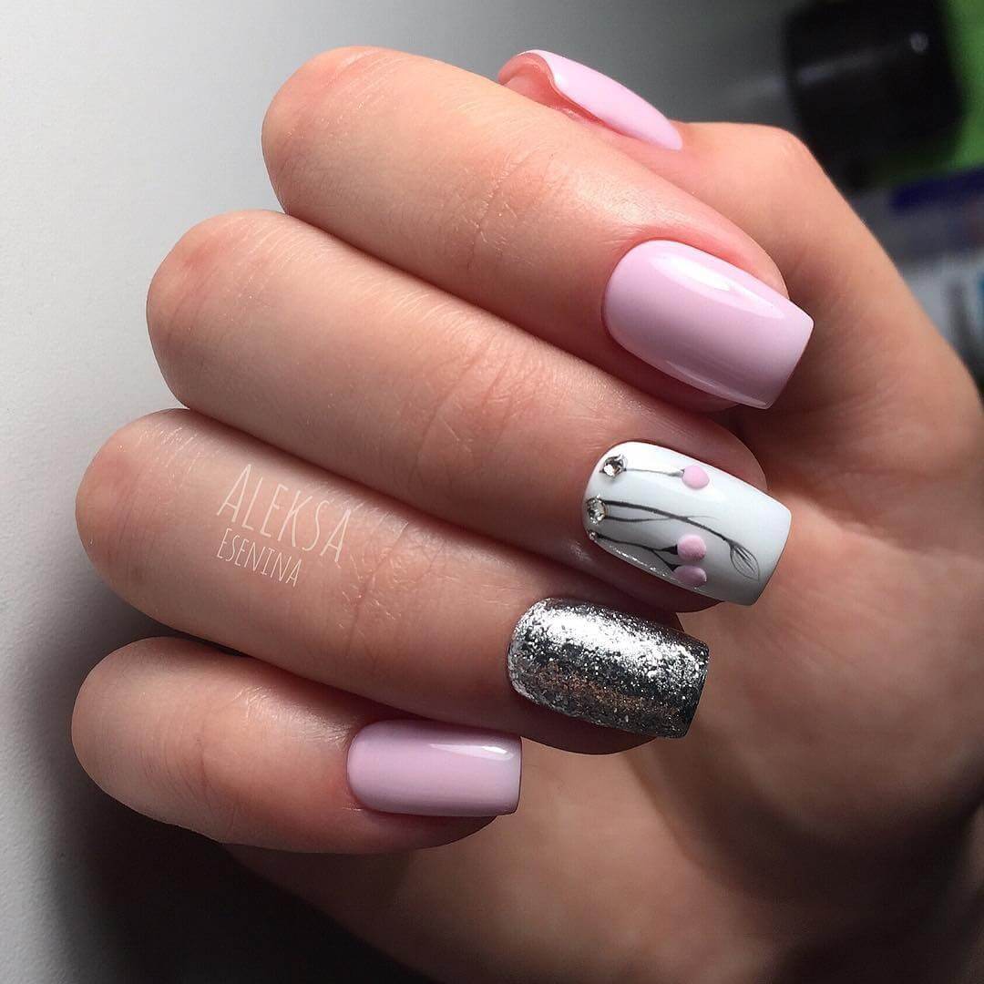 Все оттенки розового великолепно сочетаются с серебряным глиттером, жемчужной втиркой, гель-лаками с пайетками. В розовом цвете чаще всего выполняют французский и лунный маникюр, делают растяжку цвета с белым оттенком, заполняют один из ноготков прозрачными бульонками. В качестве дополнения используйте белый гель-лак. Его можно расположить на одном из ноготков в однотонном покрытии или создать с его помощью геометрический или абстрактный декор.