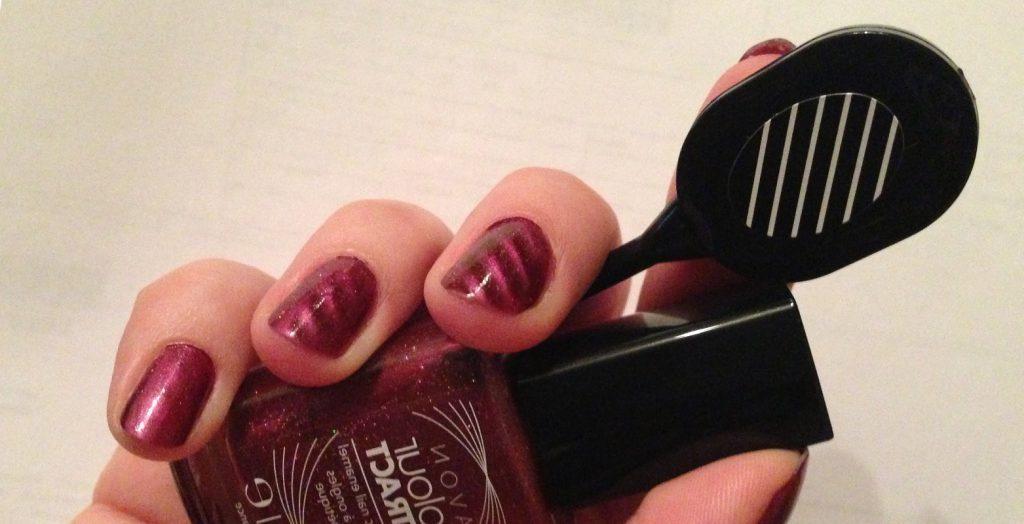 Магнитный лак для ногтей имеет отличие от обычного лака, что в нем содержатся маленькие частички металла. В продаже к лаку прилагается специальная пластинка с магнитным узором. В основе технологии нанесения магнитного лака лежит свойство магнита притягивать к себе металл. Когда мы преподносим магнитную пластинку к еще невысохшему слою лака на ногте, то металлические частицы, содержащие в лаке, начинают реагировать на магнит, в результате чего на ногтевой пластине возникает эффектный узор. Рисунок зависит от узора магнита. Это могут быть волны, поперечные полоски, диагональные полоски или продольные, полоски вида лучей которые расходятся из центра ногтевой пластины. Благодаря магниту рисунок выходит с эффектом размытости, а также получаются плавные переходы.