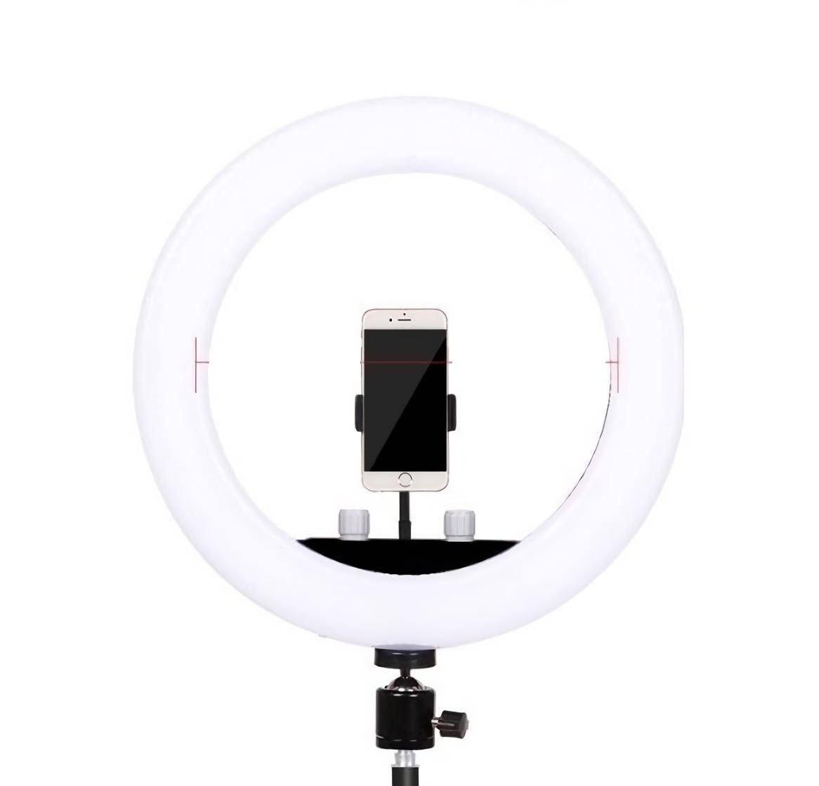 Модель классической круглой формы в фирменной сумке для хранения. Мощности светодиодов 28 Вт, а их 280 штук, хватит для студийных условий работы и помещения радиусом 5 м. Внешний диаметр кольца – 25.5 см, внутренний — 18.5 см. Производитель предлагает покупателю 4 цветовых решения – классический черный, стильный розовый, фиолетовый, красный. Сверху ламп располагается матовый рассеиватель для устранения теней, равномерного освещения с углом до 120 градусов.