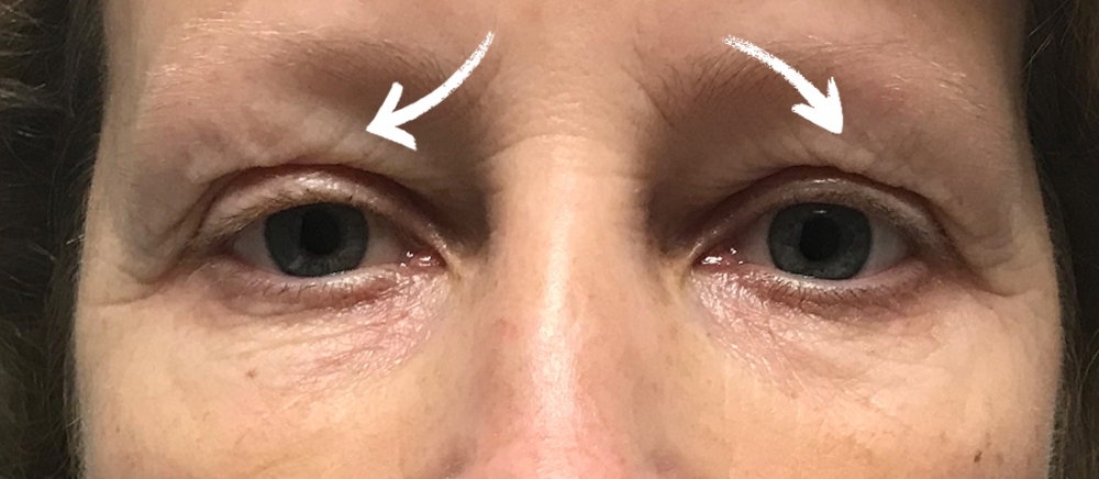 У этой дамы верхние веки настолько сползли вниз, что закрыли часть глаз. Чтобы было более понятно, мы сделали разметку на первом фото, что именно хирург собирается поправить. В результате мы убрали лишнюю кожу на верхнем веке и перераспределили имеющуюся жировую прослойку в области верхних и нижних век. Тем не менее, липофилинг здесь не помешал бы. Он бы сгладил переход в нижней части века и скрыл следы операции верхнего. Плюс ко всему, жир позволяет сохранить естественную форму и омолодить кожу.