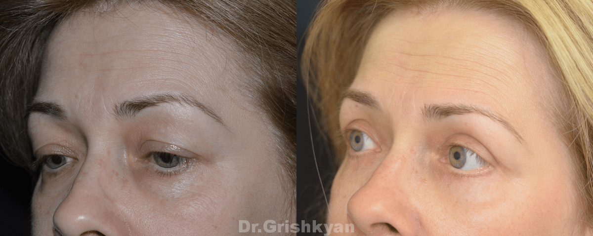 Этой пациентке, представленной на фото, была сделана классическая круговая блефаропластика в чистом виде, без липофилинга. В итоге, мы не получили «молодые» глаза, а лишь убрали излишки кожи. Если речь идет об омоложении, то в этом случае необходимо делать еще и липофилинг. Иначе, с годами, жировая прослойка деформируется, Происходит провисание нижнего века. А если жир вырывается наружу, то образуются еще и грыжи. Верхнее веко под воздействием земного притяжения и в силу возраста опускается вниз. Поэтому, если мы хотим достичь эффекта помолодевших глаз, то необходимо применить еще липофилинг век.