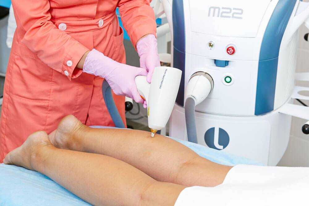 При удалении отдельных расширенных сосудов начинают с их тонкой части, а заканчивают более толстой, пока они полностью не исчезнут или не сменят свой цвет на черный или тёмно синий. Применяют и другую технику: обрабатывают точку за точкой на расстоянии 1 мм.
