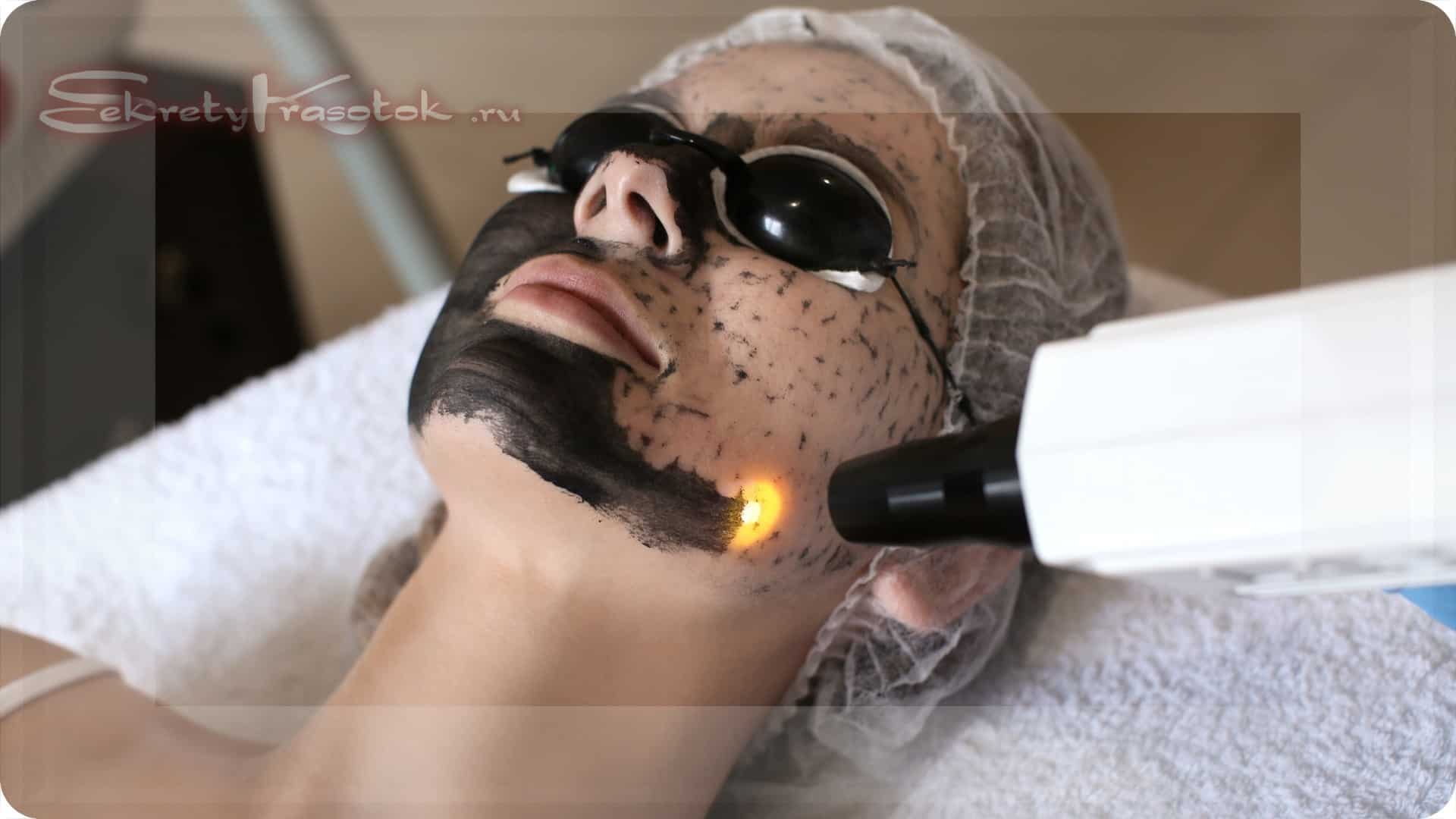 Лицо дополнительно очищается карбоновой маской, уже поверх которой происходит обработка лазером. Благодаря этому достигается более заметный эффект, с меньшим количеством «потерь».