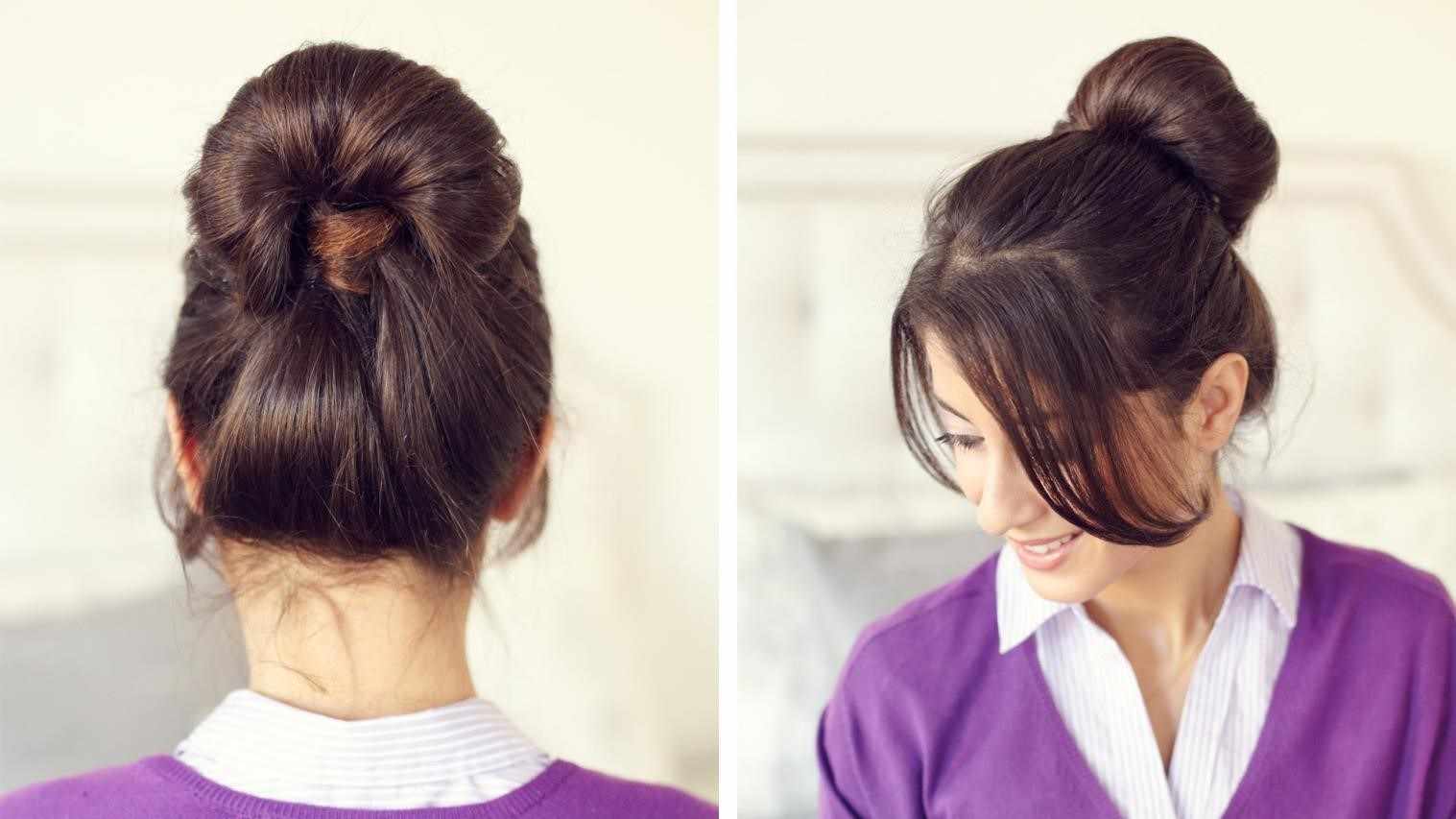 Пучок с бубликом можно выполнить всего за пять минут, при этом совершенно не обязательно обладать парикмахерскими навыками. Создание такой прически на средние волосы начинается с хвоста. Через него нужно пропустить бублик и по нему равномерно распределить волосы. Зафиксировать их резинкой. Оставшиеся концы прядей спрятать под пучок. Готовую прическу зафиксировать невидимками или шпильками.