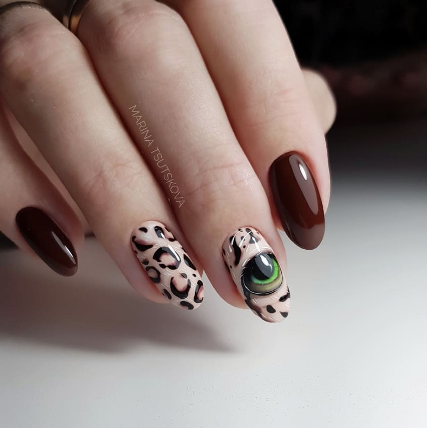 Леопардовый маникюр с рисунками. На одном из ноготков, выполненных в монохроме, можно нарисовать кошачий глаз – так мы усилим общую стилистику «анималистичности»