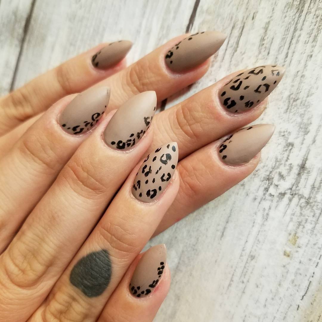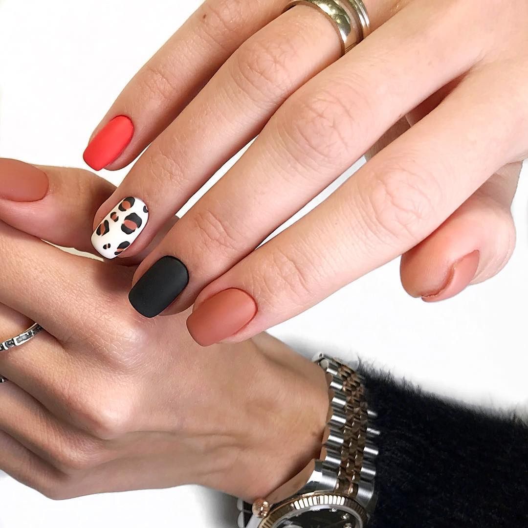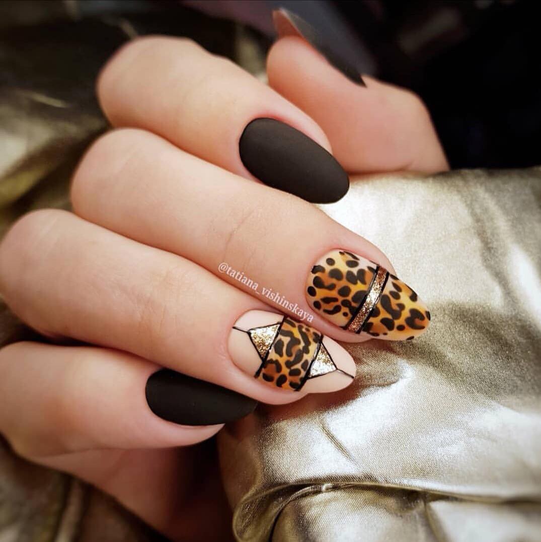 Матовое покрытие. Бесподобно смотрится черный маникюр на матовой основе. Пятна леопарда можно тоже нанести в черном цвете и сделать объемными. Они будут очень интересно выделяться за счет совершенно разных фактур. Этот дизайн также можно дополнить пудрой золотого цвета. Такая идея подойдет для любых других оттенков!