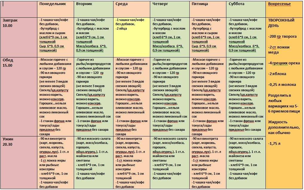Переходим непосредственно к схеме питания на Лиепайской диете. Помним, что среда у нас разгрузочный день, который обязательно следует проводить каждую неделю и на следующий день после застолий, срывов или перееданий. Количество приемов пищи в день ровно три, перекусы недопустимы, как и ночное обжорство.