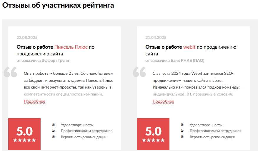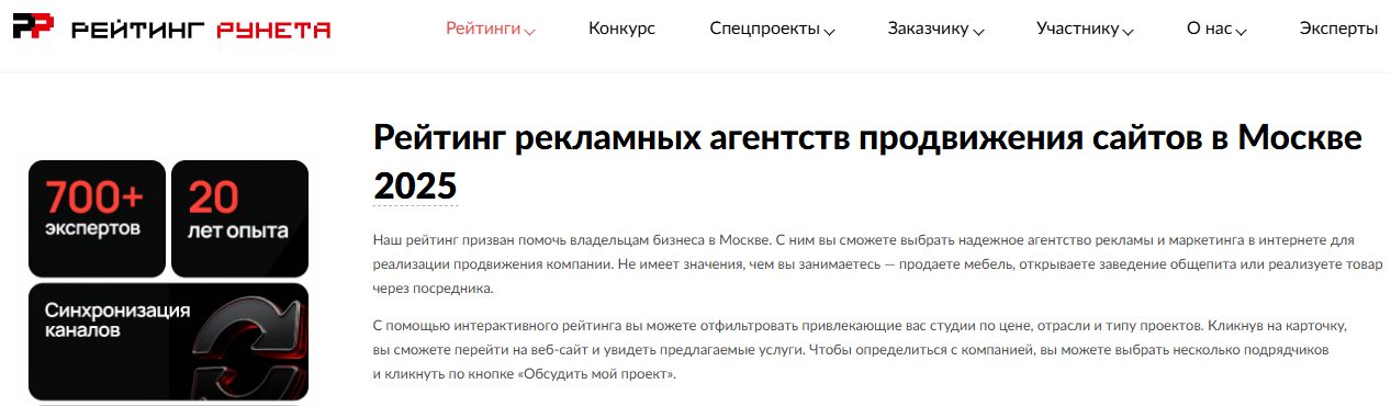 Профильные рейтинги отфильтровывают по специализации. Ruward, Tagline, Sostav публикуют топы с разбивкой по направлениям: performance, SEO, контекст, таргет. Изучайте методологию составления — прозрачные критерии важнее громкого названия рейтинга.