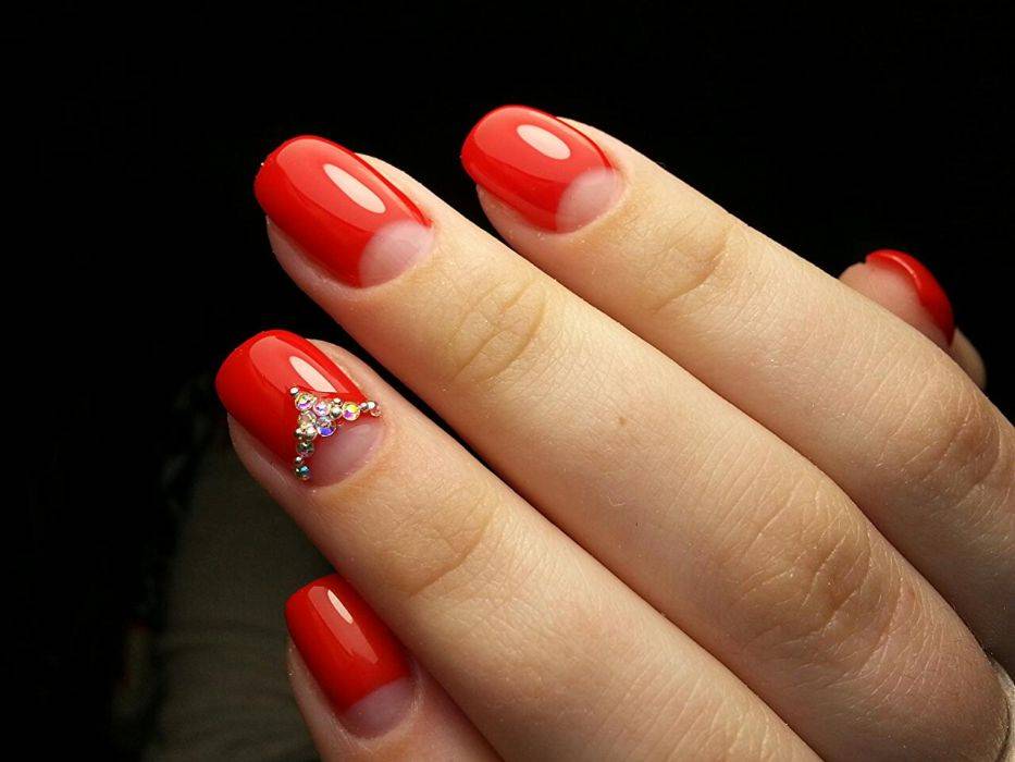 В этом варианте, на ногти наноситься основной (красный) цвет. После чего по верхней границе лунулы закрепляется стикер. Далее лунула закрашивается в белый цвет. Как только гель-лак просохнет в УФ лампе, наноситься финишное покрытие, которое придаст ногтям особый блеск и устойчивость к внешним воздействиям.