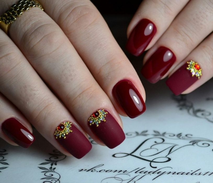 Этакая классика жанра. Красный цвет в маникюре считается базовым и подходит под любую одежду и макияж. Красный маникюр особенно популярен осенью, этот цвет часто сочетают с золотом, стразами и камифубуки. В лунном дизайне пользуется большой популярностью модное сочетание черного и красного цвета. Если вы не хотите делать очень яркий маникюр, то отдайте предпочтение вишневому, более темному винному оттенку или цвету марсала. Красивые шеллаки цвета вишни есть в палитре CND, если нужен вечерний вариант, то в линейке брендов ENTITY и MASURA присутствуют глубокие бордовые оттенки с микроблестками, а классический красный есть практически у каждого производителя, бренд OPI даже выпустили оригинальный красный “Coca-Cola”. Из магнитных гель-лаков можно выделить красивый малиново-красный оттенок с золотистым отливом из коллекции MASURA, который называется “Малиновая кошка”, а также светло-бордовый оттенок TNL «Magnet lux».