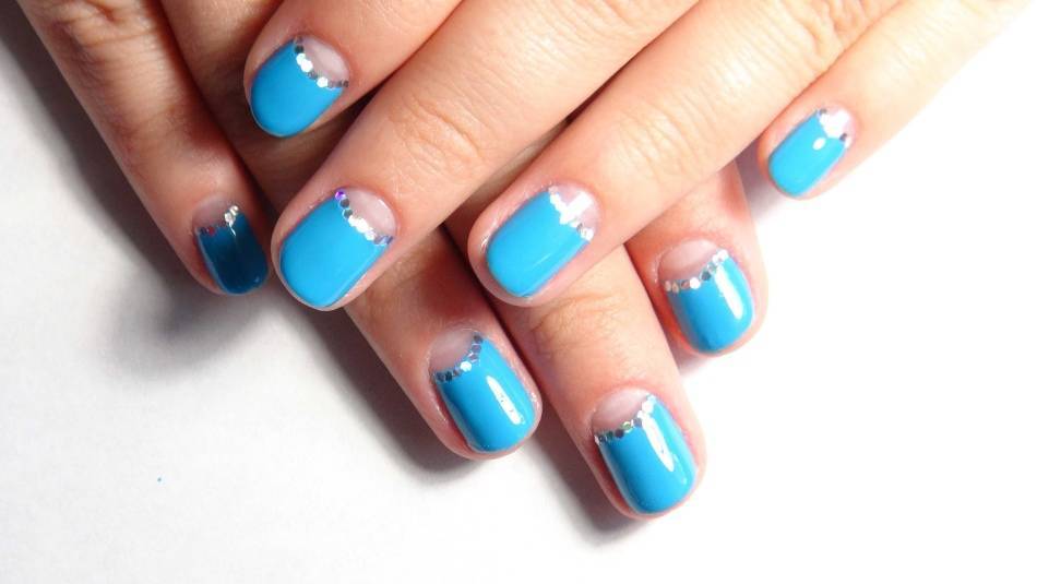 Маникюр, в котором полукруг у основания ногтя остается без покрытия. Границу, где начинается лак можно декорировать бульонками, стразами, мелким жемчугом или металлическими заклепками. На создание такого симпатичного дизайна ногтей уходит совсем немного времени, а если еще использовать стойкий гель-лак, который моментально отверждается под воздействием УФ-лучей, то такой маникюр просто палочка-выручалочка для очень занятых девушек. Тратить много времени на маникюр гель-лаком не придется, а ручки будут выглядеть очень ухоженно и модно.