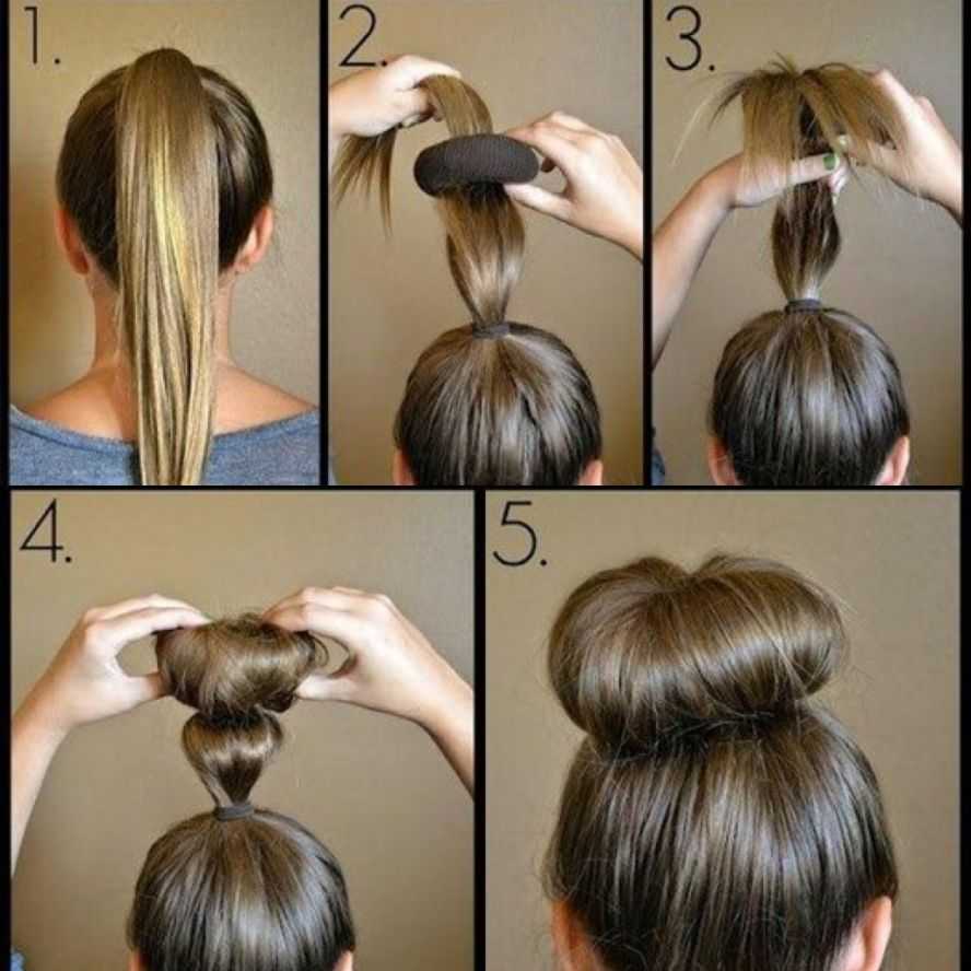 Инструкция, как сделать пучок на голове для танцев с валиком на фото.