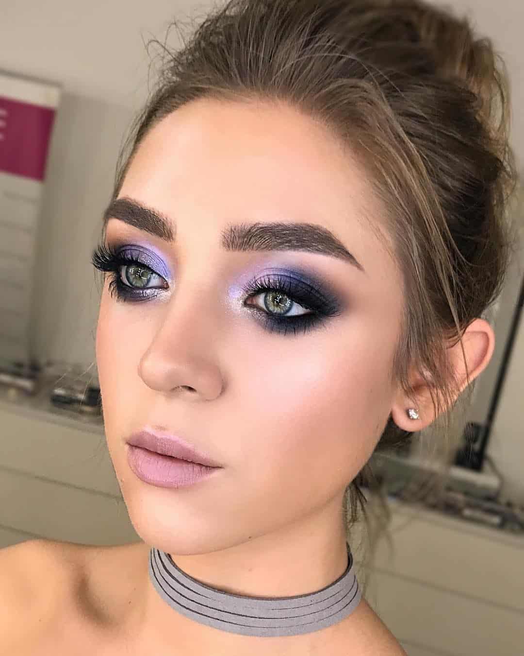 Театральный. Он отличается драматичностью образа и яркими цветами. Это такой макияж, который будет виден с дальних рядов. Длинные накладные ресницы, аквамариновый тон на водной линии, легкая растушевка плотной темной обводки глаза, изящная стрелка и густой «smoky eyes» в фиолетовых тонах. Это интригует, завораживает и вполне может быть сделано самостоятельно.