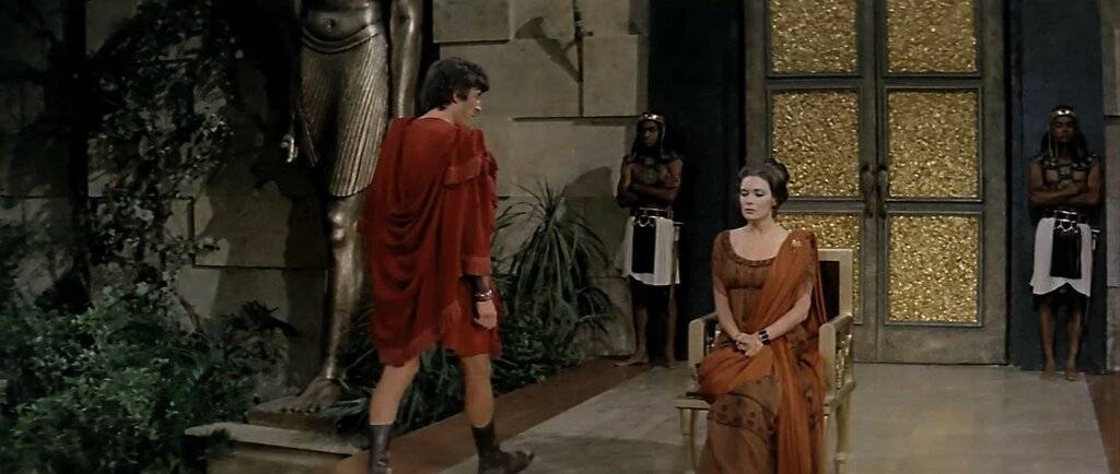 Клеопатра в фильме показана глазами своего врага Октавиана, это властная и жестокая женщина, пытающаяся вертеть Марком Антонием и губящая в итоге их обоих. И даже укус змеи, кажется, причиняет ей не боль, а наслаждение.