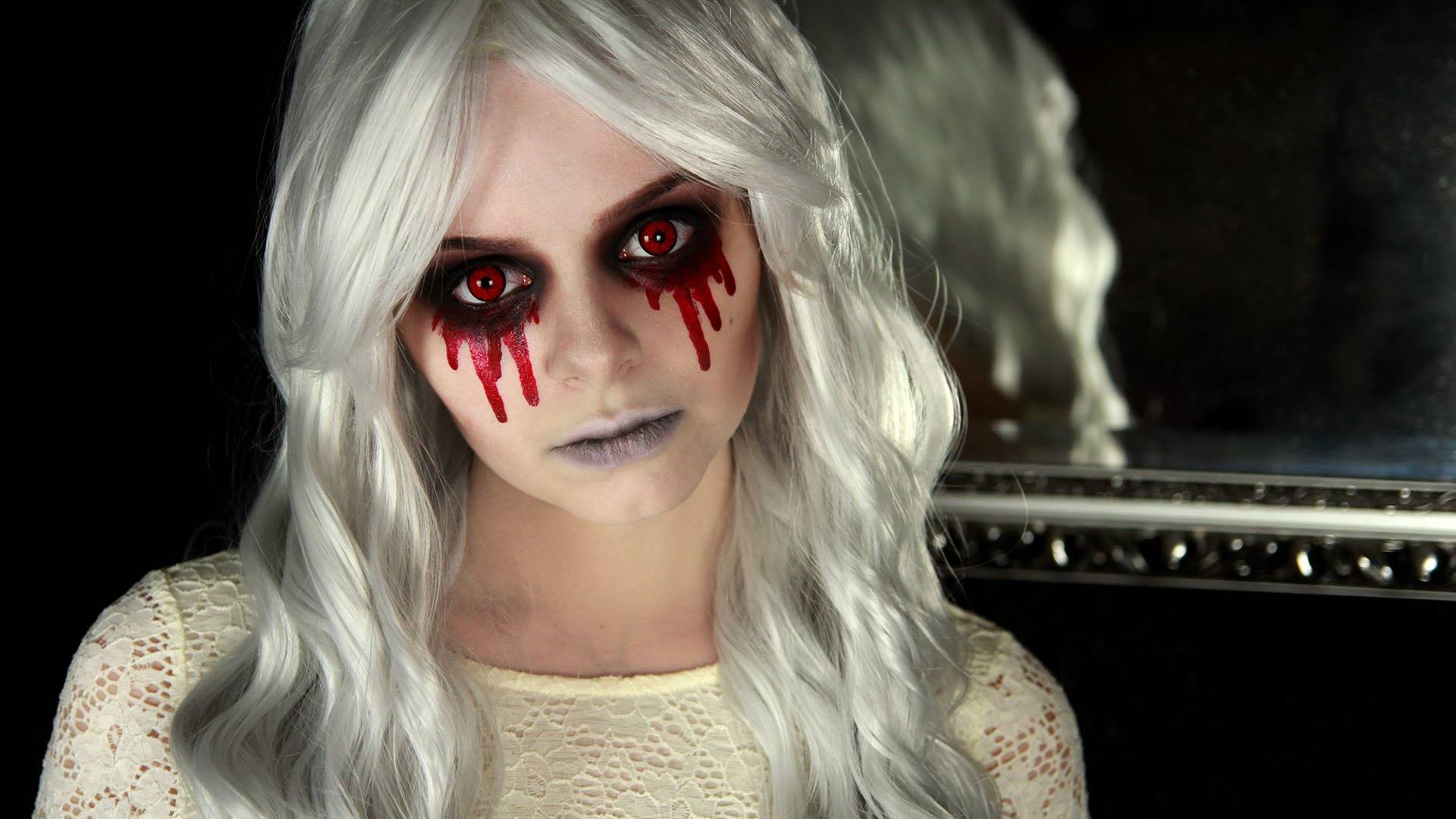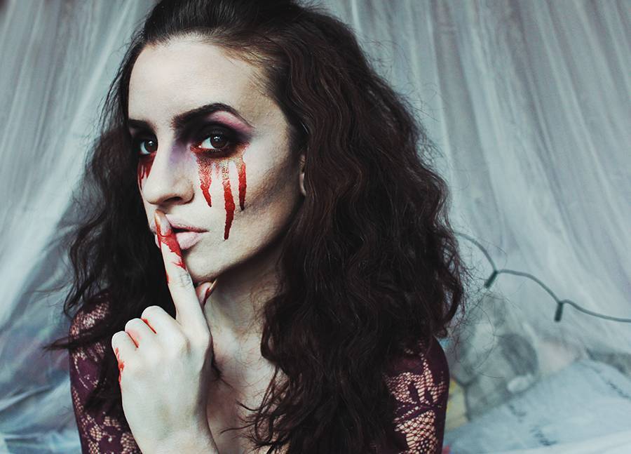 Наряду со смертельной бледностью, она будет намекать на трагическую историю жертвы потусторонних сил. Выделите глаза красным карандашом или подводкой, или нанесите красные тени на веки и размажьте их.