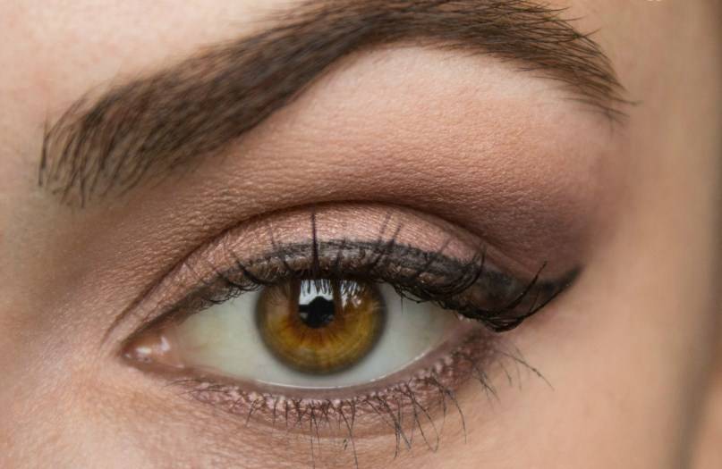 - Светло-бежевые оттенки накладываются под бровь, а светлый тон используется в качестве основы под тени. Края теней следует растушевать. Более темные оттенки располагают у внешнего края века и выводятся на границу подвижного века.