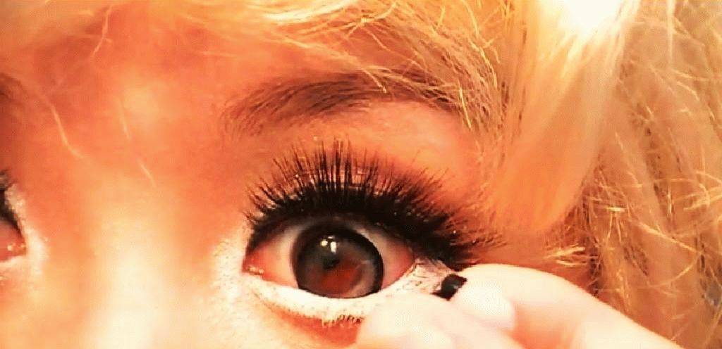 7) В работе с ресницами главная задача — добиться эффекта кукольности. Черной тушью в два слоя прокрасьте верхние, нижние реснички, особенно тщательно те, которые находятся у внешнего края глаза, затем к своим ресницам добавьте накладные — они придадут «кукольности» взгляду.