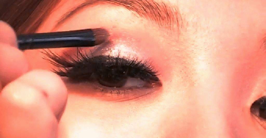 5) В аниме макияжа глаз самое трудное в пошаговом исполнении — создание формы, приближенной к азиатской. Для достижения «восточного» эффекта, карандашом рисуется линия, максимально приближенная к линии роста ресниц верхнего века до середины, затем она немного «приподнимается», а потом рисуется как в самом начале. Далее, следует взять тени светлых теней и нанести на всю область подвижного века.