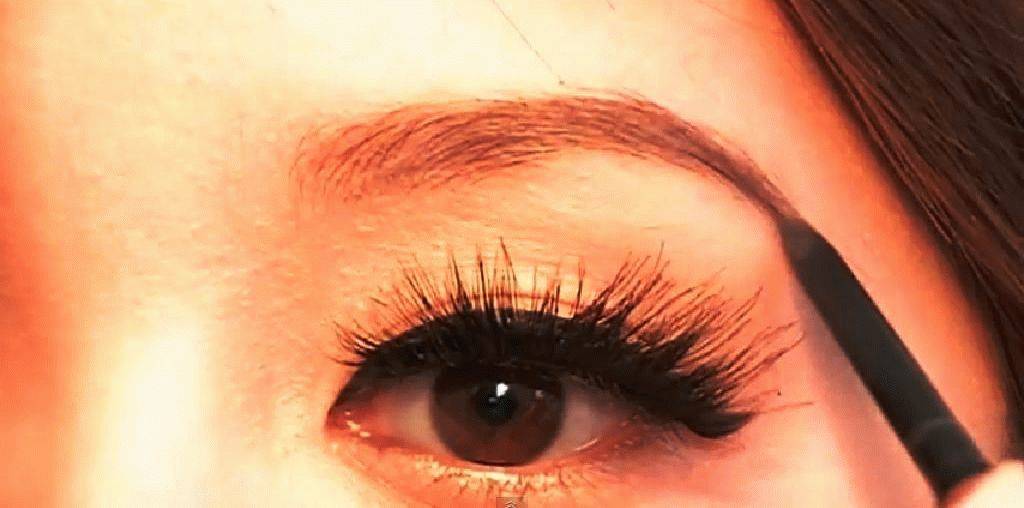 Сначала на верхние и нижние веки наносятся очень светлые (белые, кремовые и т.п.) тени. Далее мы берем черную подводку и рисуем линию на верхнем подвижном веке. Подводку нужно наносить очень тонко и прямо по линии ресниц. На внутреннем угле глаза линия опускается вниз, а на внешнем — сначала слегка вниз, потом — вверх.