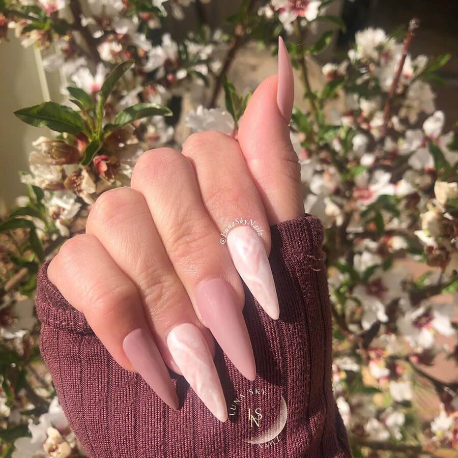 нюд и лаванда. Еще один интересный вариант для покрытия, если хочется чего-нибудь оригинального. Сам по себе лавандовый оттенок довольно яркий, даже если взять самые приглушенные оттенки. А вот добавить немного лаванды к бежевому нюду — это идеально. Можно сделать любой небольшой лавандовый акцент на ногтях.