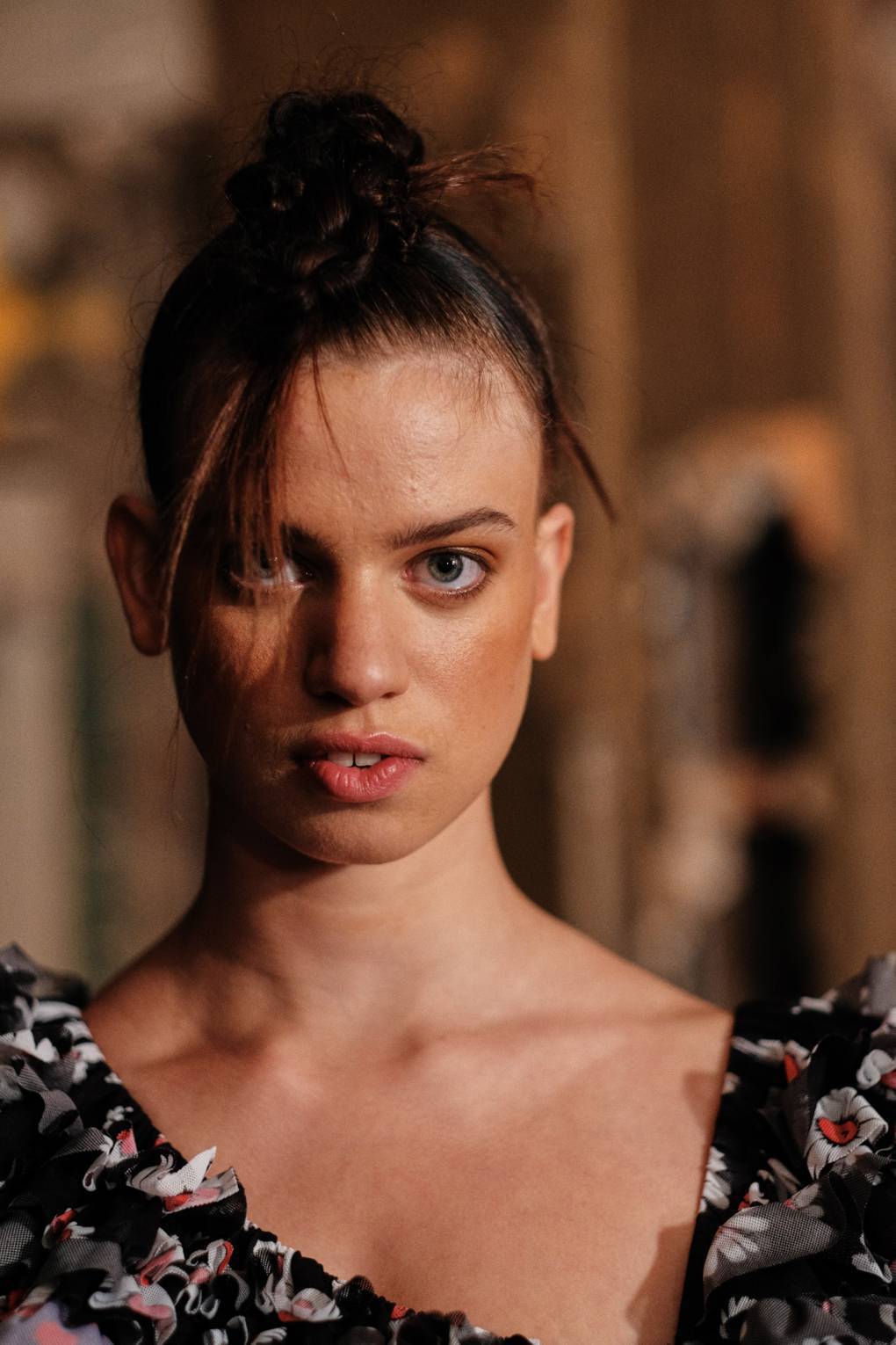 Оригинально выглядят яркие глаза на фоне почти бесцветного нюдового визажа.