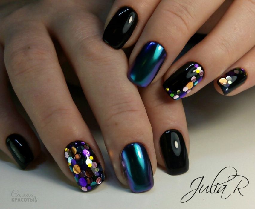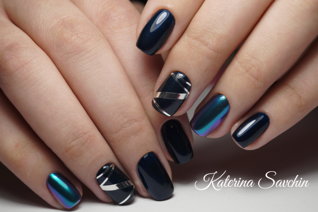 Вообще с зеркальной пудрой можно придумать различные дизайны, как по цвету, так и по содержанию. Самые красивые варианты на фото с идеями маникюра.
