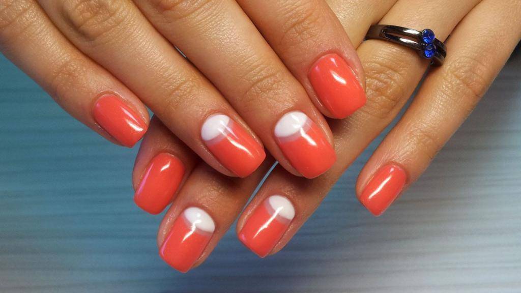 В последнее время просто колоссальную популярность приобрел маникюр, который мастера называют «Обратный френч». Исполнить его в домашних условиях удастся даже новичкам, ведь это один из легких дизайнов гель-лаками. Нанесение бело-кораллового маникюра осуществляется следующим образом.