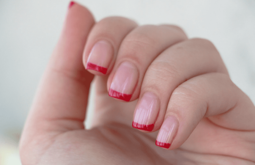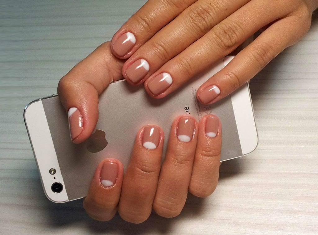 Для базового цвета подойдёт персиковый, пастельный, розовый цвет, а кончик ногтя, так называемая «улыбка» делается с помощью белого лака.