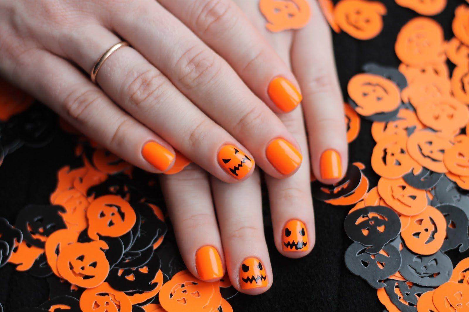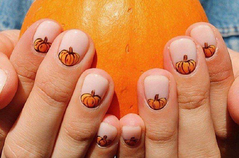 Тыквенная тема, наиболее распространенная в дизайнах Хэллоуина. В качестве базового цвета выбирают такой тон, чтобы оранжевая тыква не сливалась с фоном. Можно использовать градиент и разноцветие. Тыковку изображают символически: глазки и улыбка или целиком. Если рисунок схематический, то его можно использовать на всех ногтях. А вот художественное изображение лучше сделать на одном, а остальные декорировать пламенем. Поскольку основной фон сам по себе яркий: от красного до мятного, то блестки и стразы не использовать. Они могут перегрузить дизайн и будут выглядеть нелепо. Форму ногтей для такого маникюра можно выбирать любую. Но больше всего для такого маникюра подойдет квадрат, мягкий квадрат и овал.