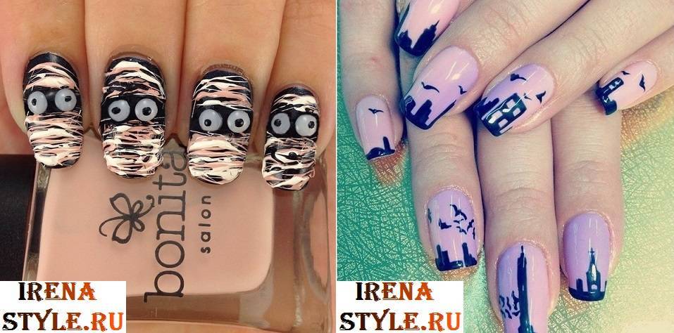 - В основном, маникюр на Хэллоуин создается разноцветными лаками. Вспомогательные элементы: иголка, фломастеры, блестки, стразы и т.д.