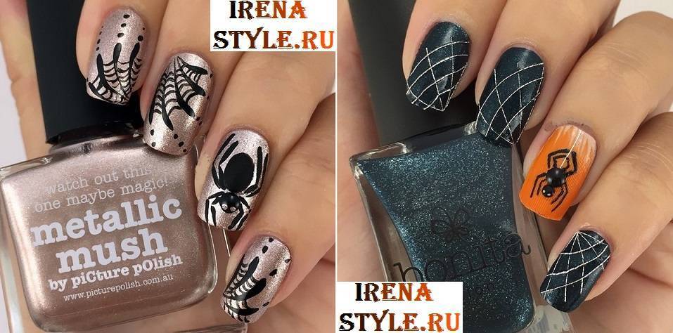 - В основном, маникюр на Хэллоуин создается разноцветными лаками. Вспомогательные элементы: иголка, фломастеры, блестки, стразы и т.д.
