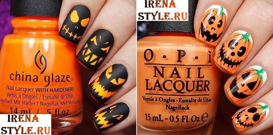 Тыквенная тема, наиболее распространенная в дизайнах Хэллоуина. В качестве базового цвета выбирают такой тон, чтобы оранжевая тыква не сливалась с фоном. Можно использовать градиент и разноцветие. Тыковку изображают символически: глазки и улыбка или целиком. Если рисунок схематический, то его можно использовать на всех ногтях. А вот художественное изображение лучше сделать на одном, а остальные декорировать пламенем. Поскольку основной фон сам по себе яркий: от красного до мятного, то блестки и стразы не использовать. Они могут перегрузить дизайн и будут выглядеть нелепо. Форму ногтей для такого маникюра можно выбирать любую. Но больше всего для такого маникюра подойдет квадрат, мягкий квадрат и овал.
