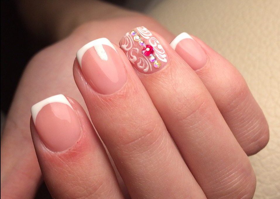Для украшения ноготков светлым лаком лучше воспользоваться нежно-розовыми оттенками, пудровыми и бежевыми.