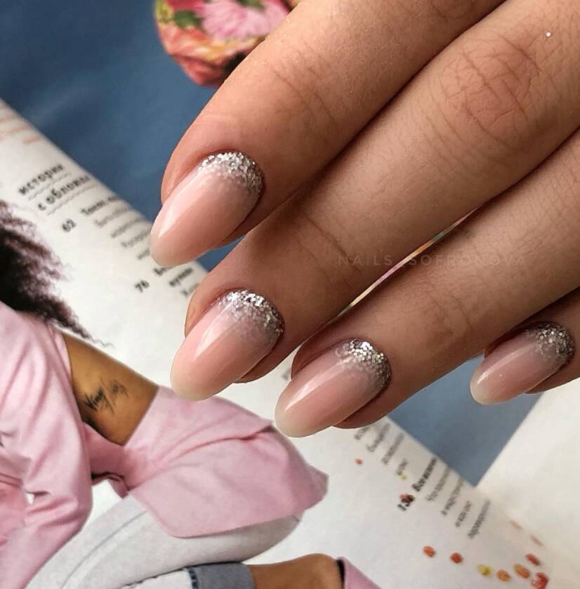 Маникюр с блестками приходится ярким акцентом в образе на коротких ногтях. Блестки, создавая интересную текстуру, не могут остаться незамеченными.